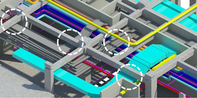 三維管線綜合是在BIM三維建筑設(shè)計(jì)的基礎(chǔ)之上對(duì)機(jī)電專業(yè)的管線與橋架進(jìn)行走向優(yōu)化、標(biāo)高調(diào)整以及碰撞檢查。設(shè)計(jì)師可以通過(guò)三維設(shè)計(jì)軟件在計(jì)算機(jī)中搭建與實(shí)際工程1:1的建筑模型,并且通過(guò)各專業(yè)協(xié)同功能可以讓不同專業(yè)的設(shè)計(jì)師更全面的獲取相關(guān)專業(yè)的信息,更完整的獲取其他設(shè)計(jì)師的設(shè)計(jì)意圖。由于建筑信息模型的使用,可以避免傳統(tǒng)二維設(shè)計(jì)中不同設(shè)計(jì)師間信息傳遞的缺失與誤解,從而在設(shè)計(jì)中提前解決了許多以前只有在工地施工中才能碰到的問(wèn)題,提高了設(shè)計(jì)的質(zhì)量并有效保證了施工的周期控制與質(zhì)量控制。